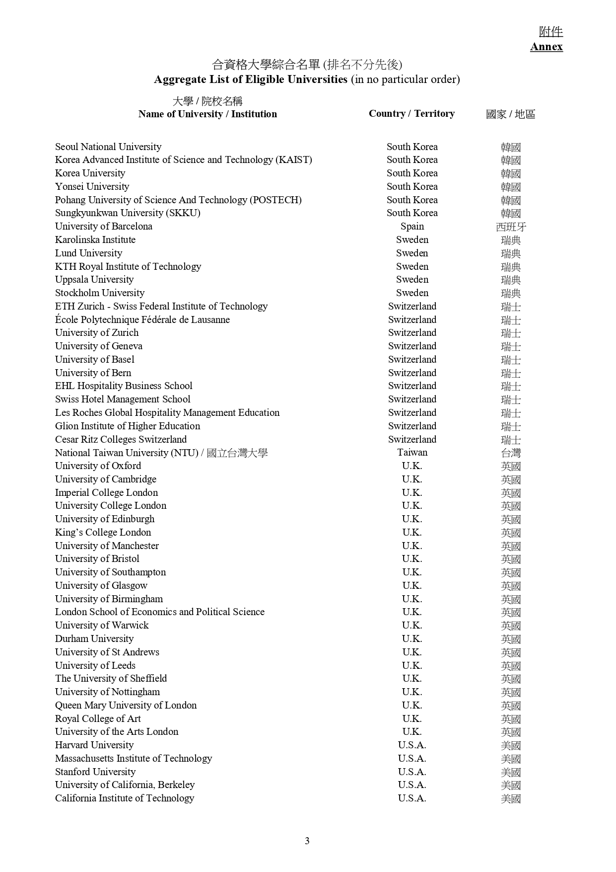 政府於二零二五年十二月二十八日公布,高端人才通行證計劃(高才通計劃)經年度更新的合資格大學綜合名單將於二○二六年一月一日生效。